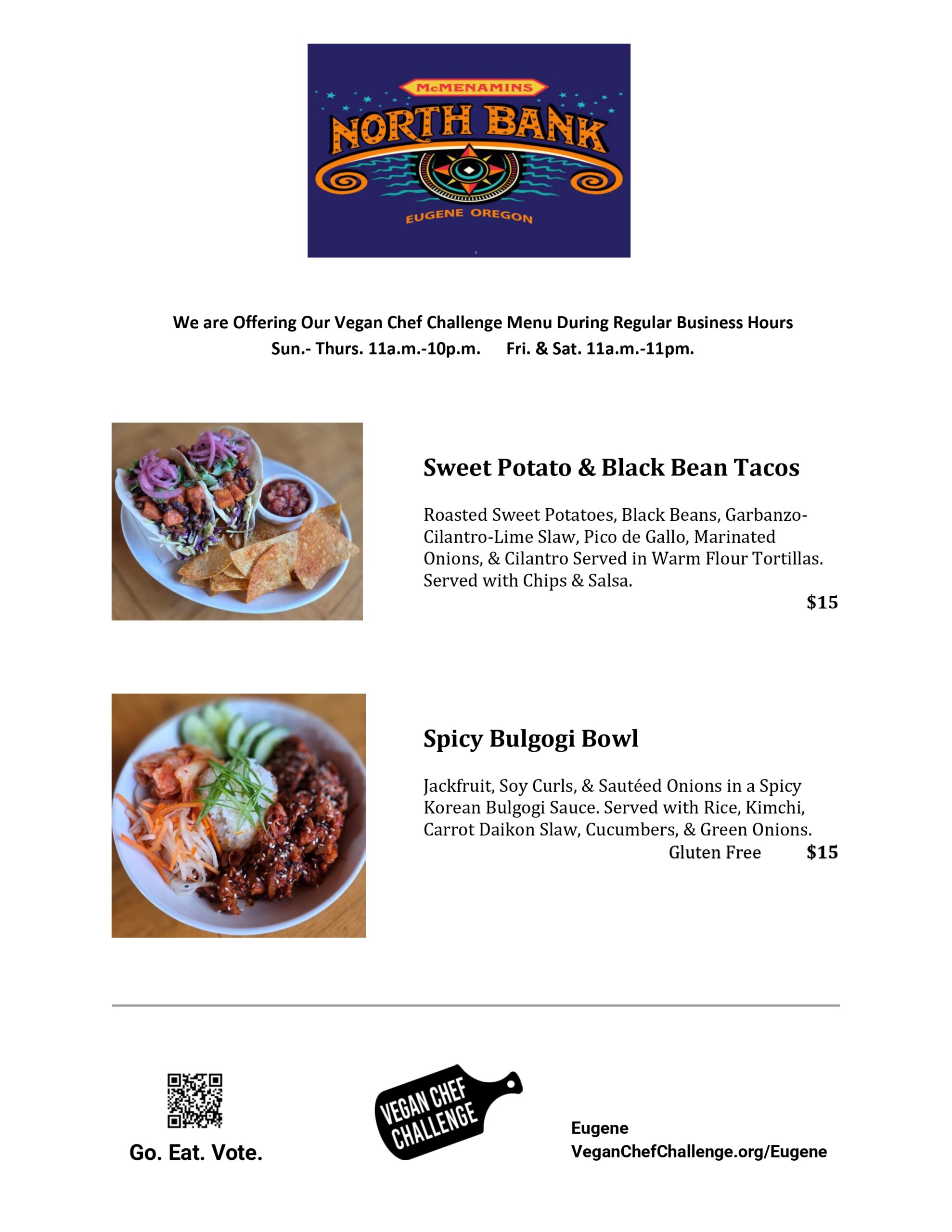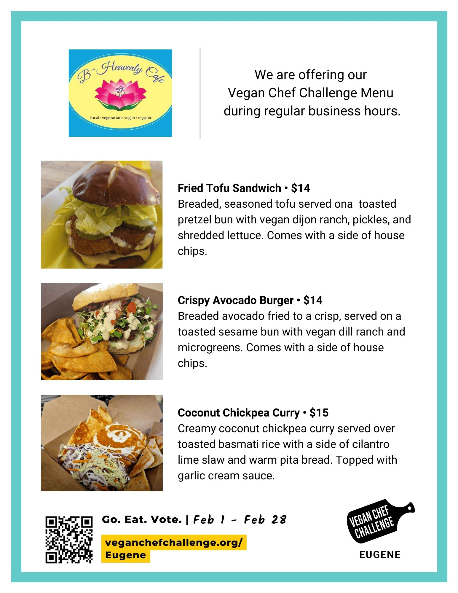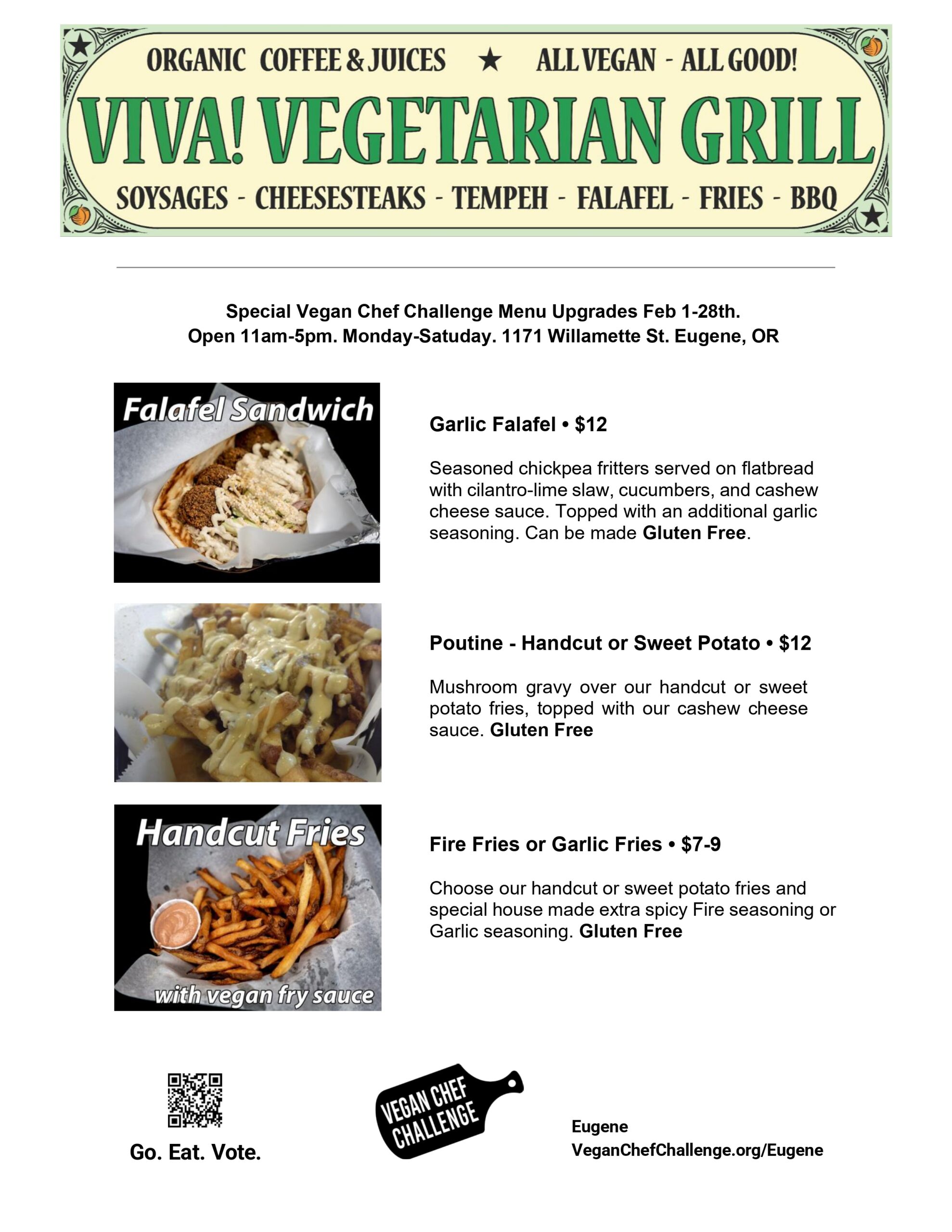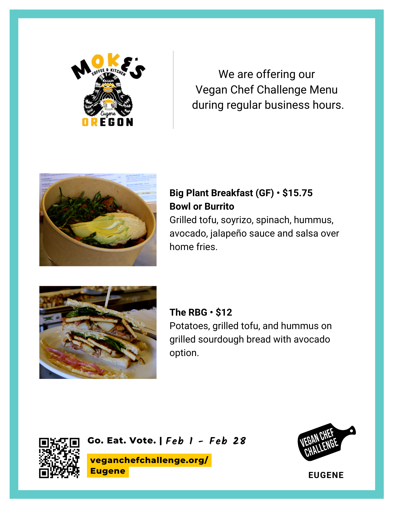 During this time, restaurants throughout the Eugene area will feature special vegan menu items. Diners have the opportunity to go out, enjoy meals, review/rate menus, and post photos of the delicious vegan meals they have ordered.
