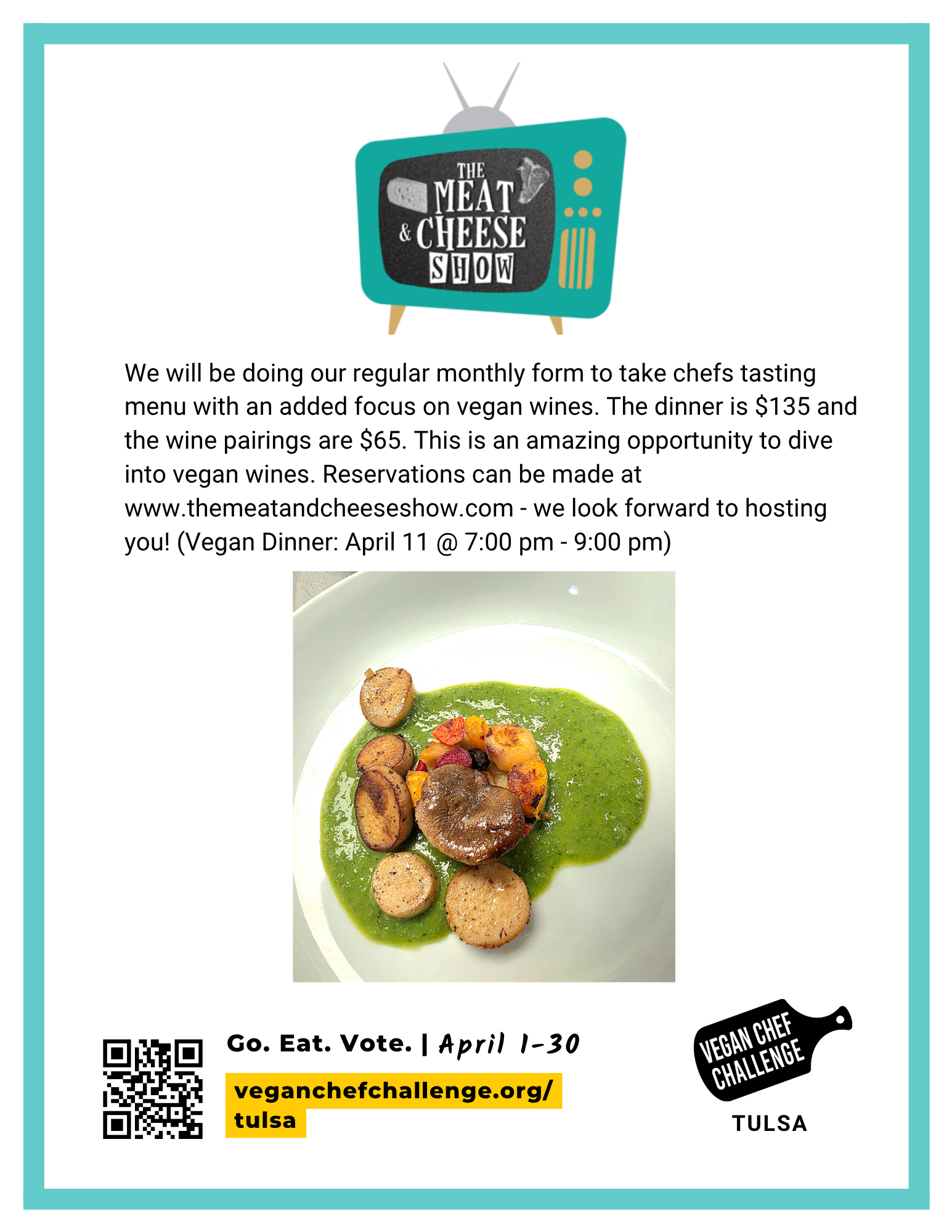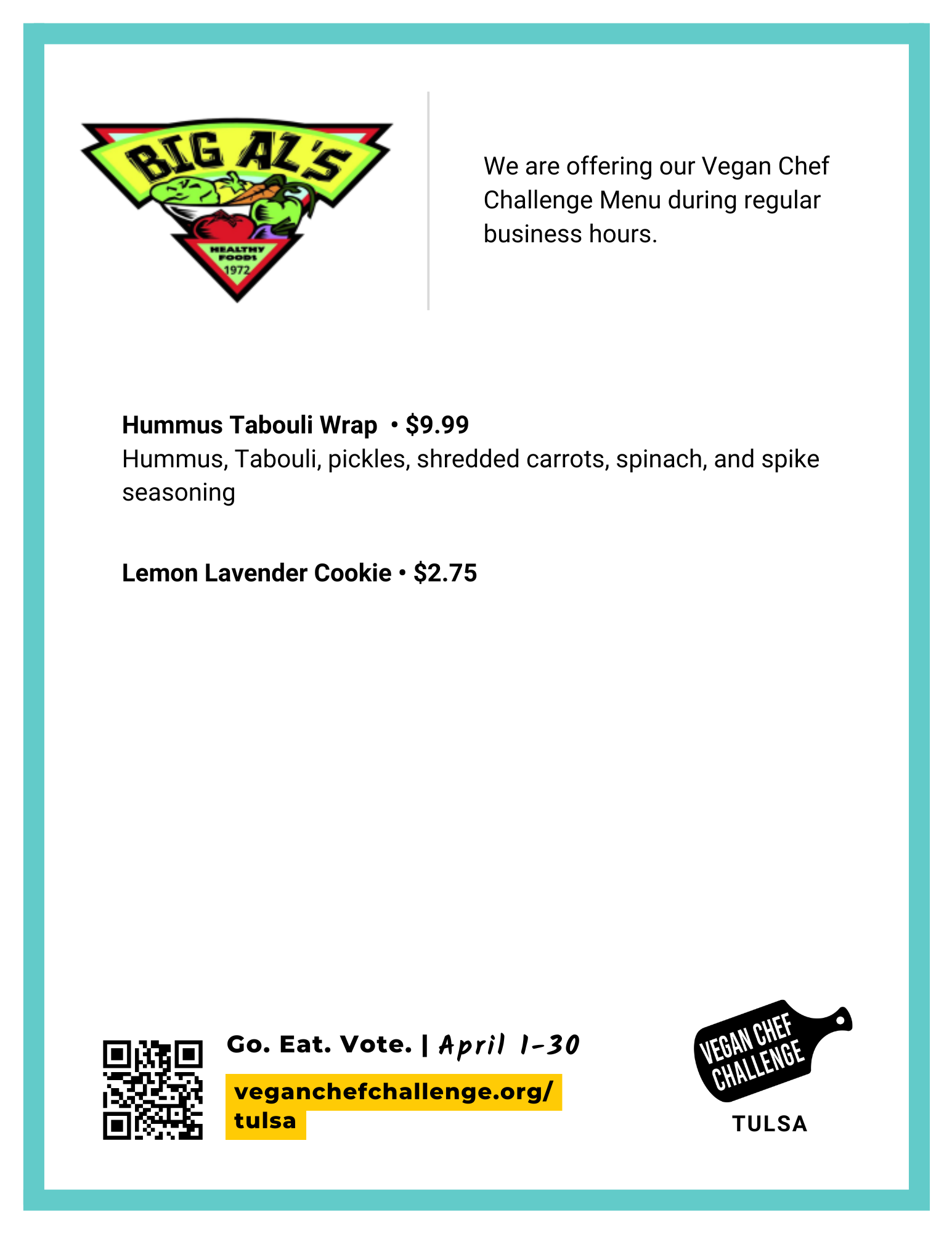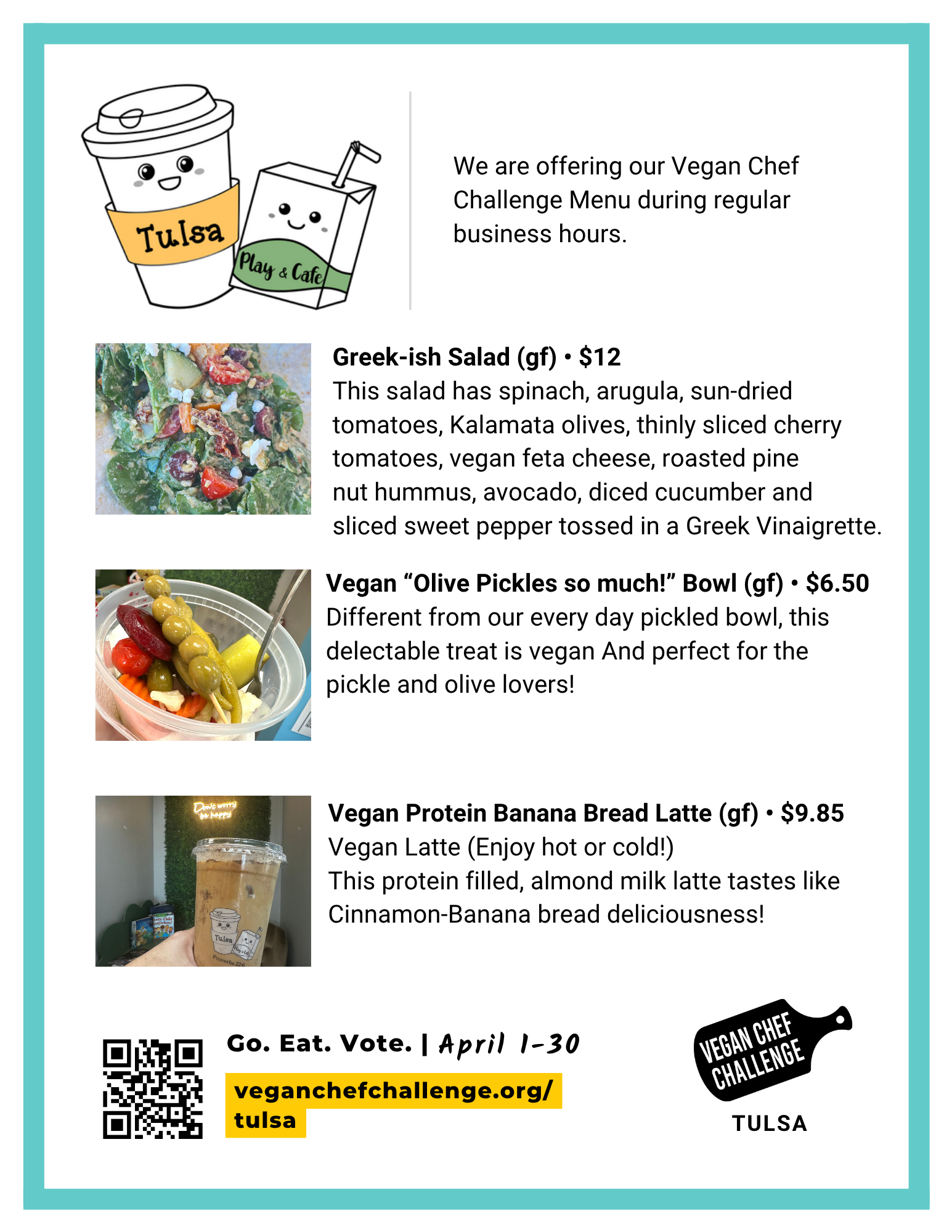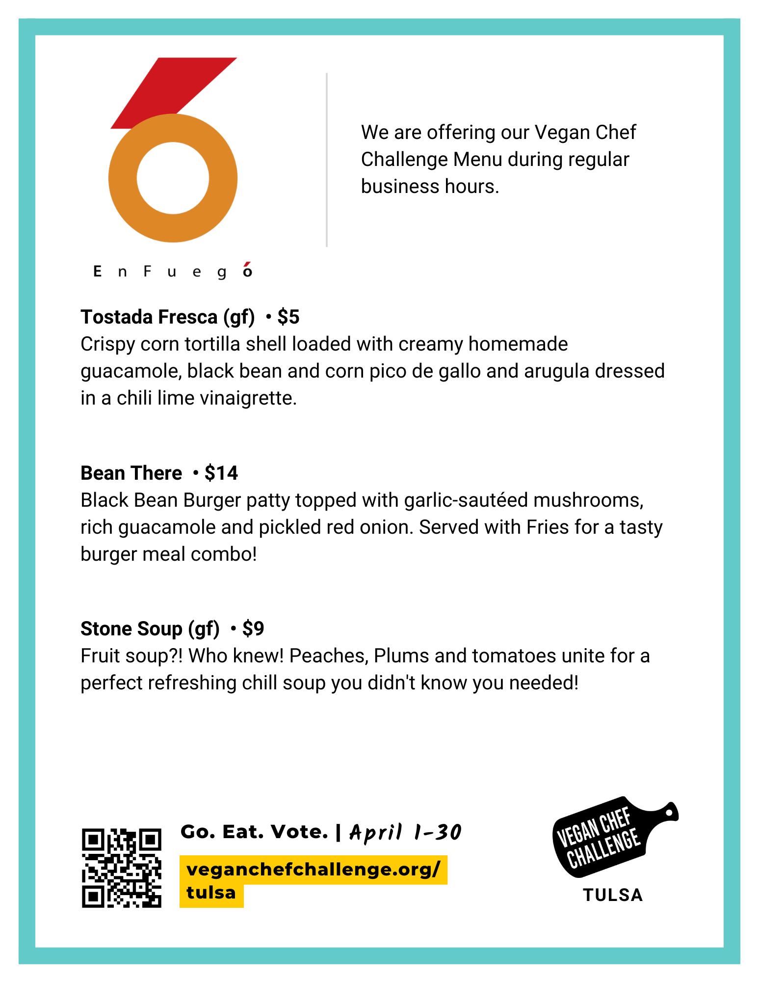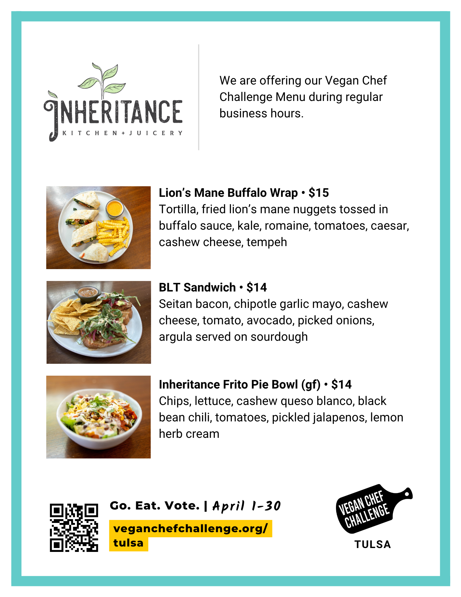 This challenge’s theme is Go Green, Tulsa! We will be encouraging diners to consider plant-based for the environment.