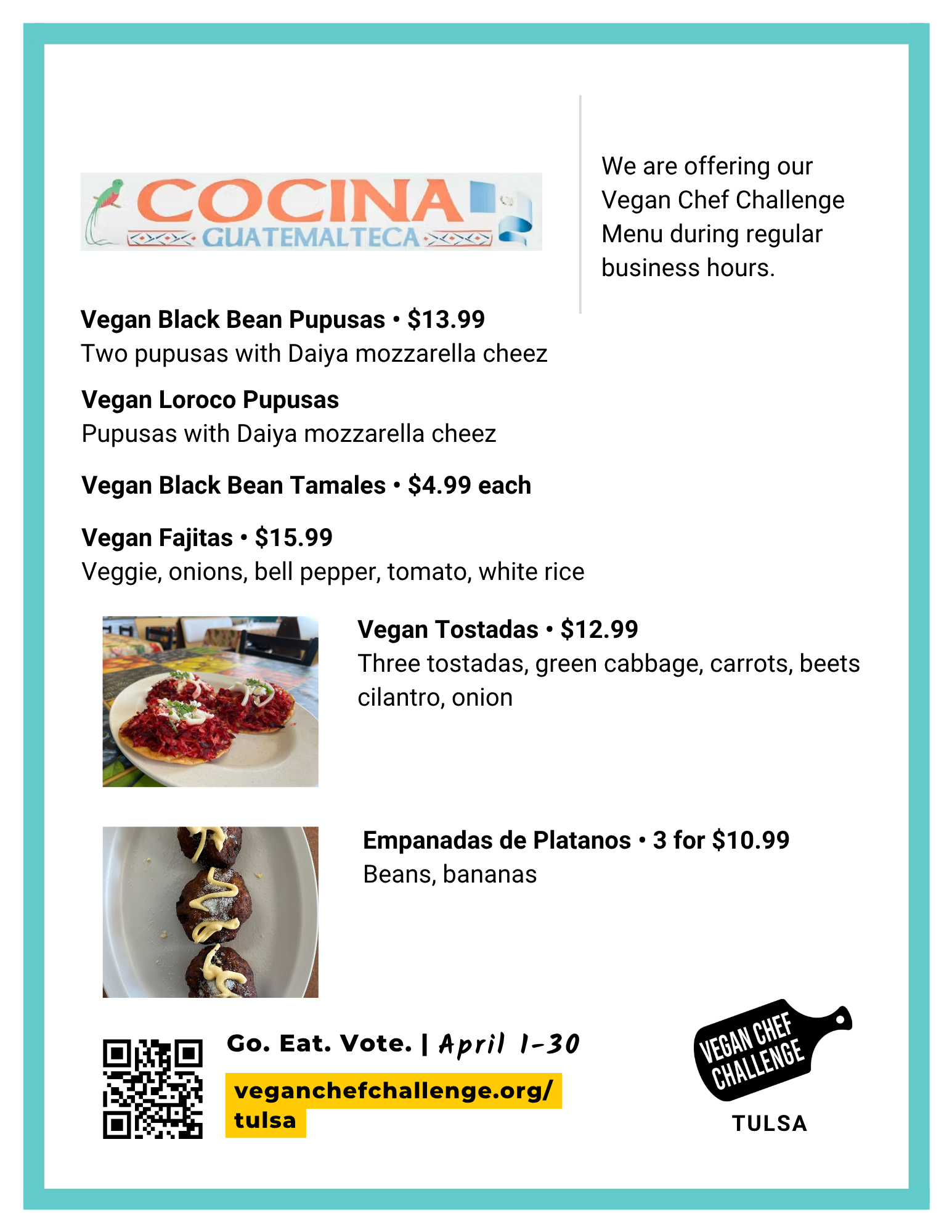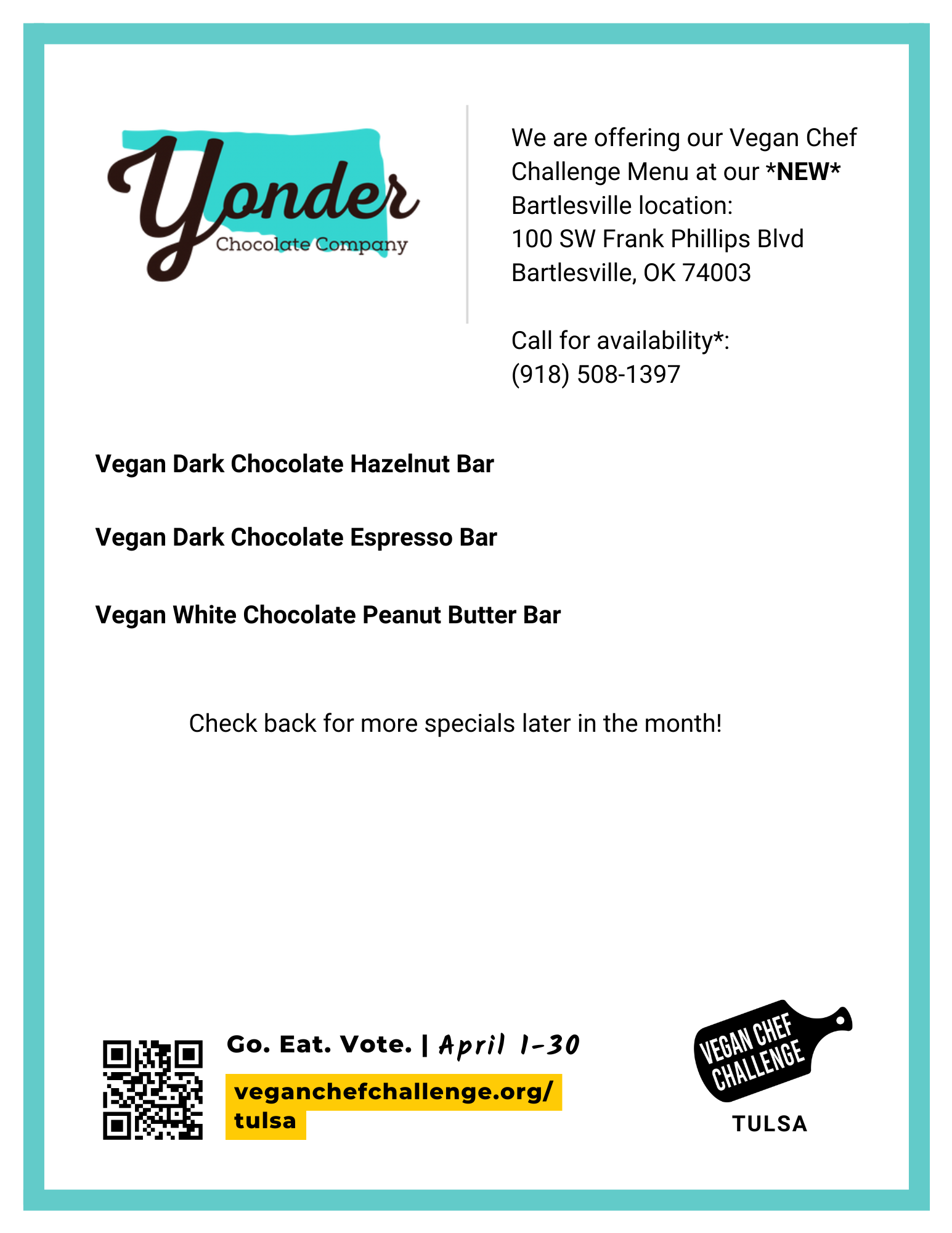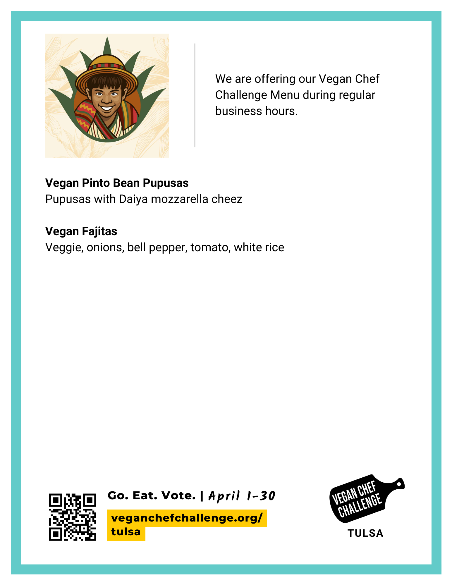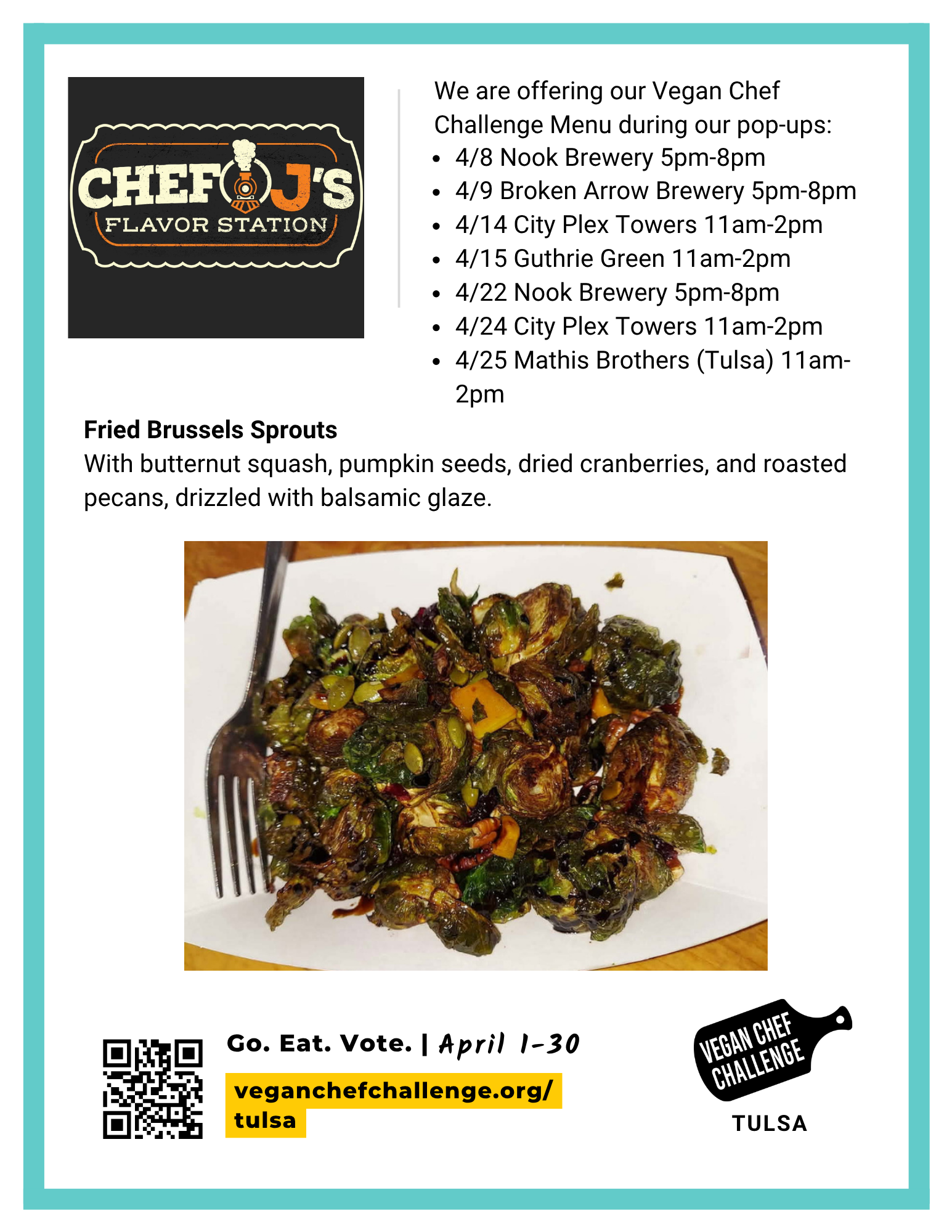 This challenge’s theme is Go Green, Tulsa! We will be encouraging diners to consider plant-based for the environment.
