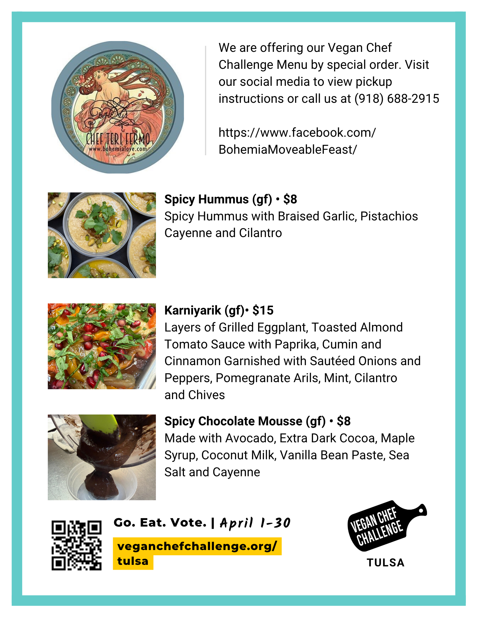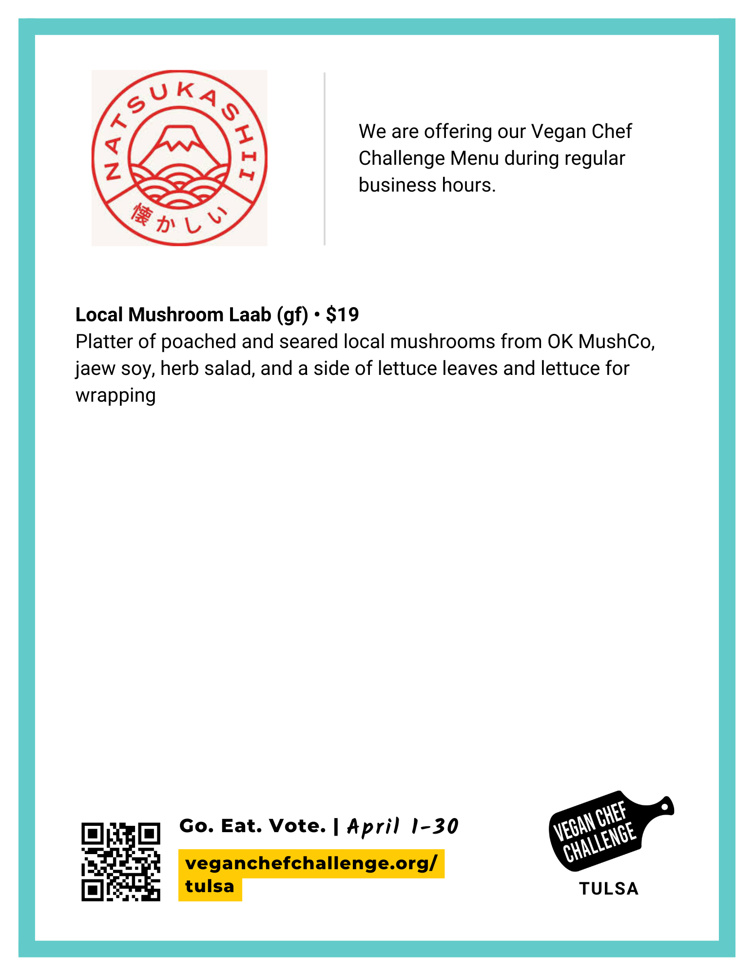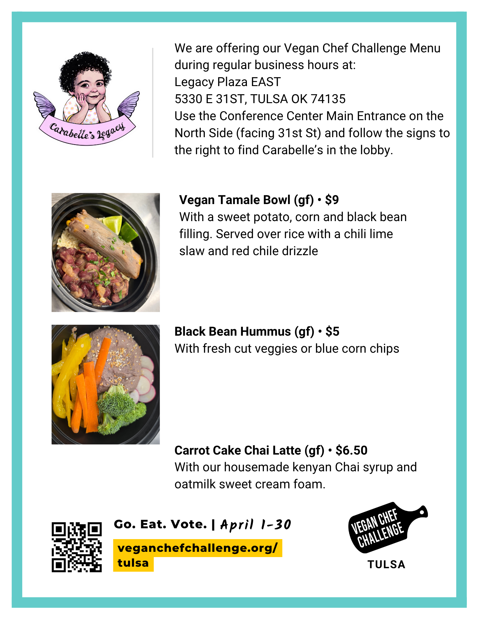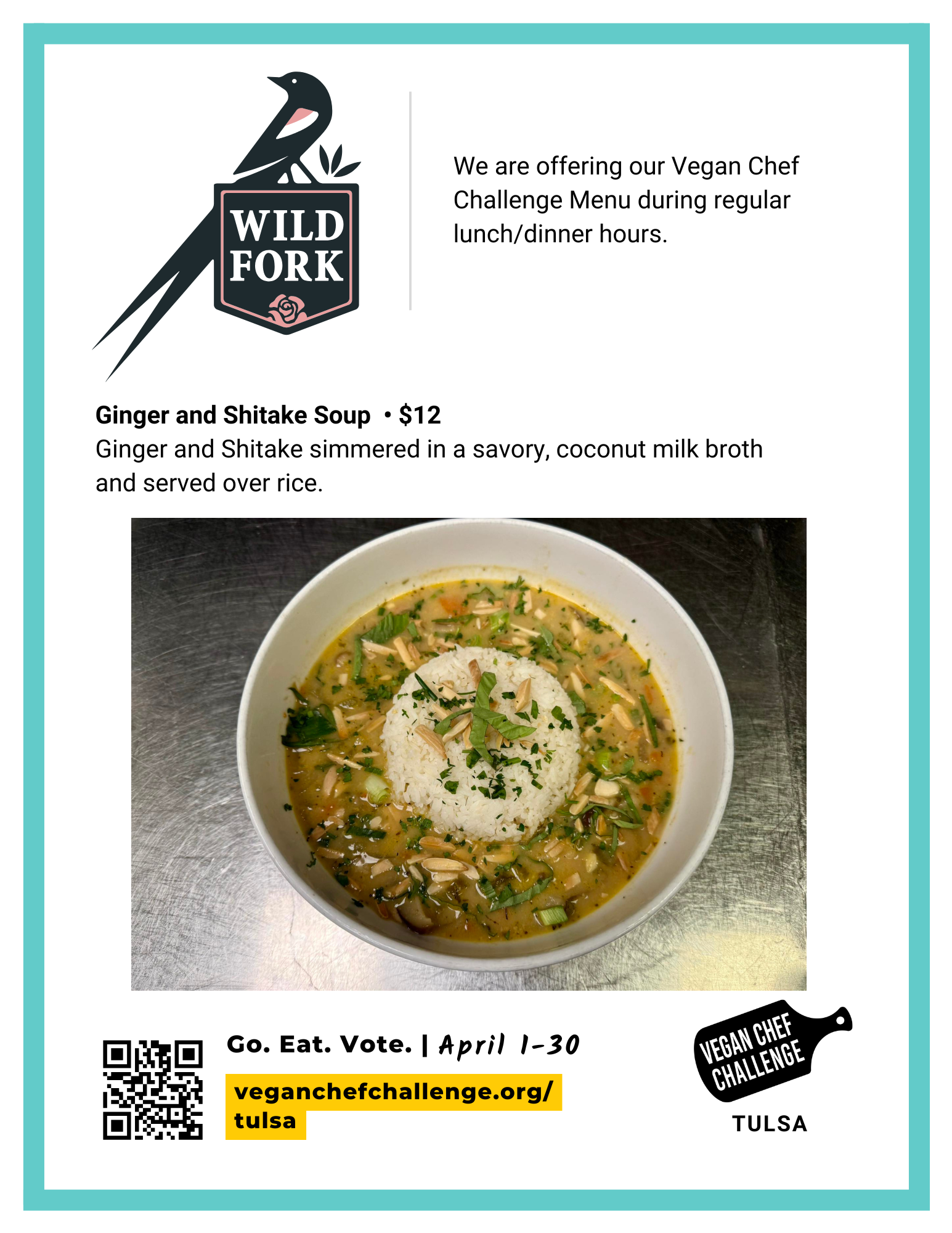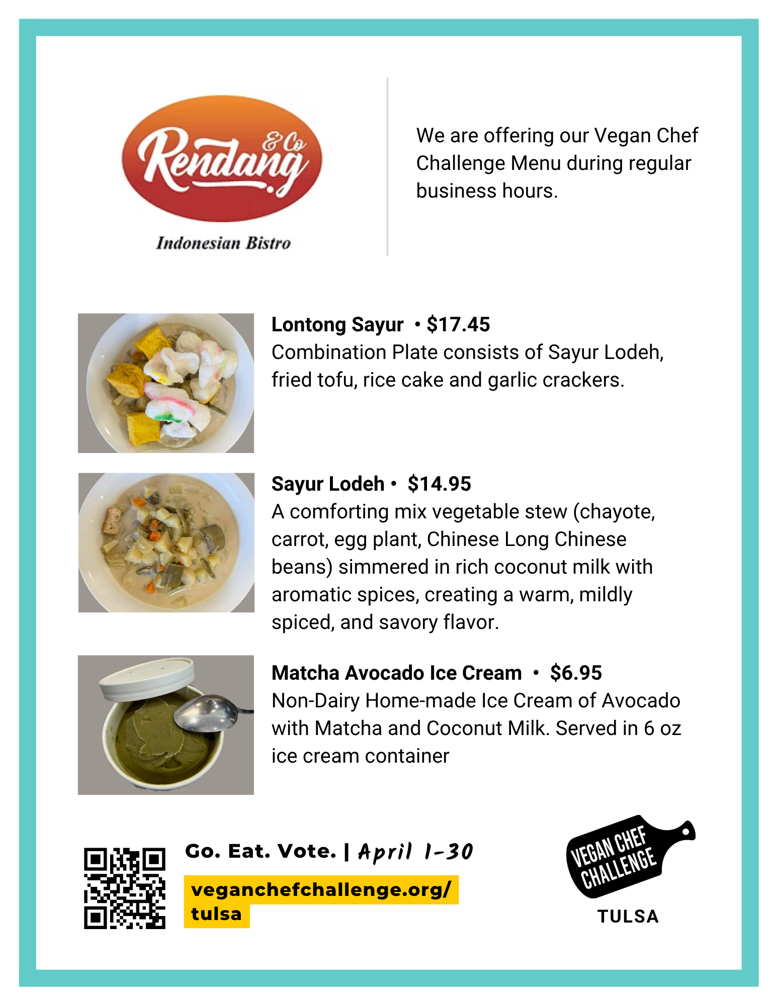 This challenge’s theme is Go Green, Tulsa! We will be encouraging diners to consider plant-based for the environment.