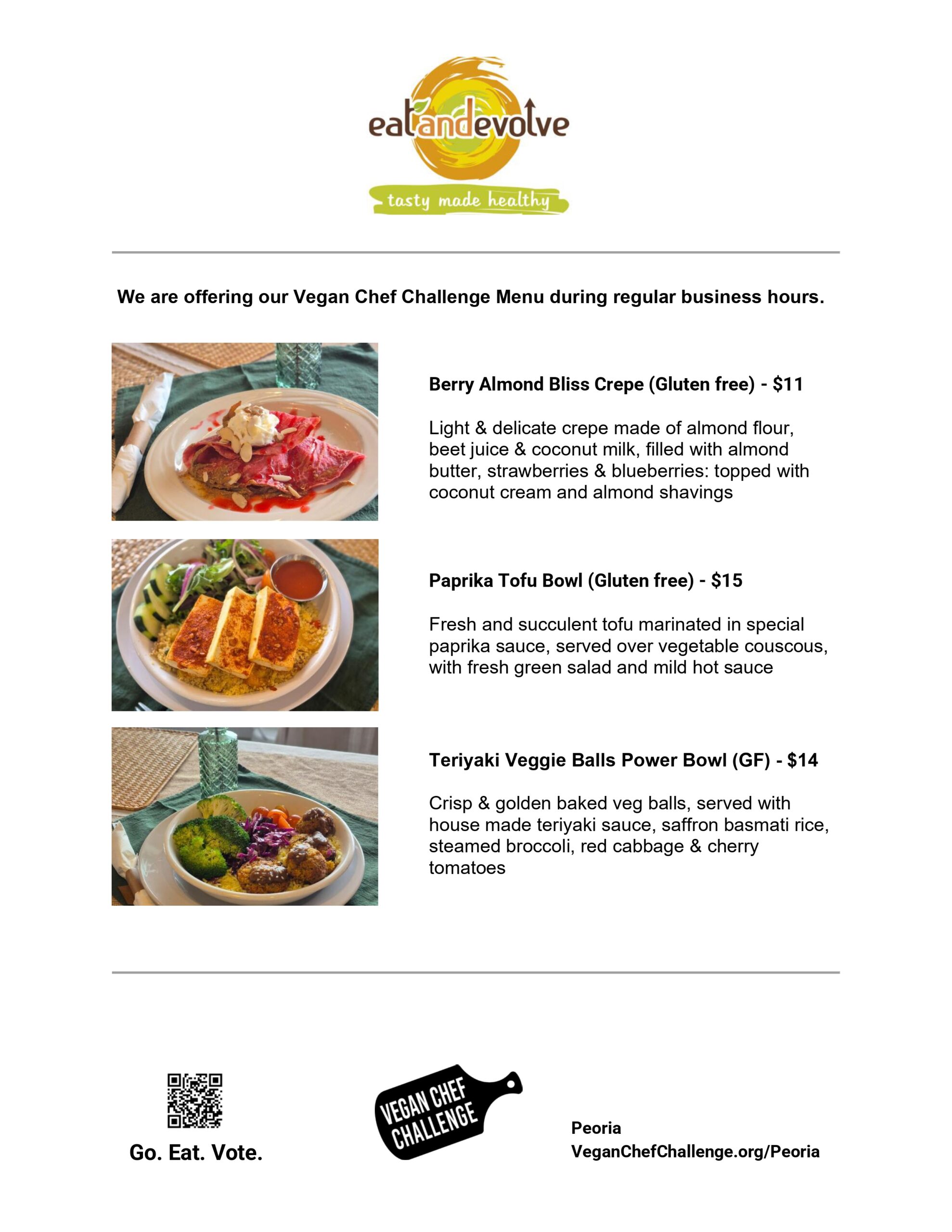 During this time, restaurants throughout the Peoria area will feature special vegan menu items. Diners have the opportunity to go out, enjoy meals, review/rate menus, and post photos of the delicious vegan meals they have ordered.