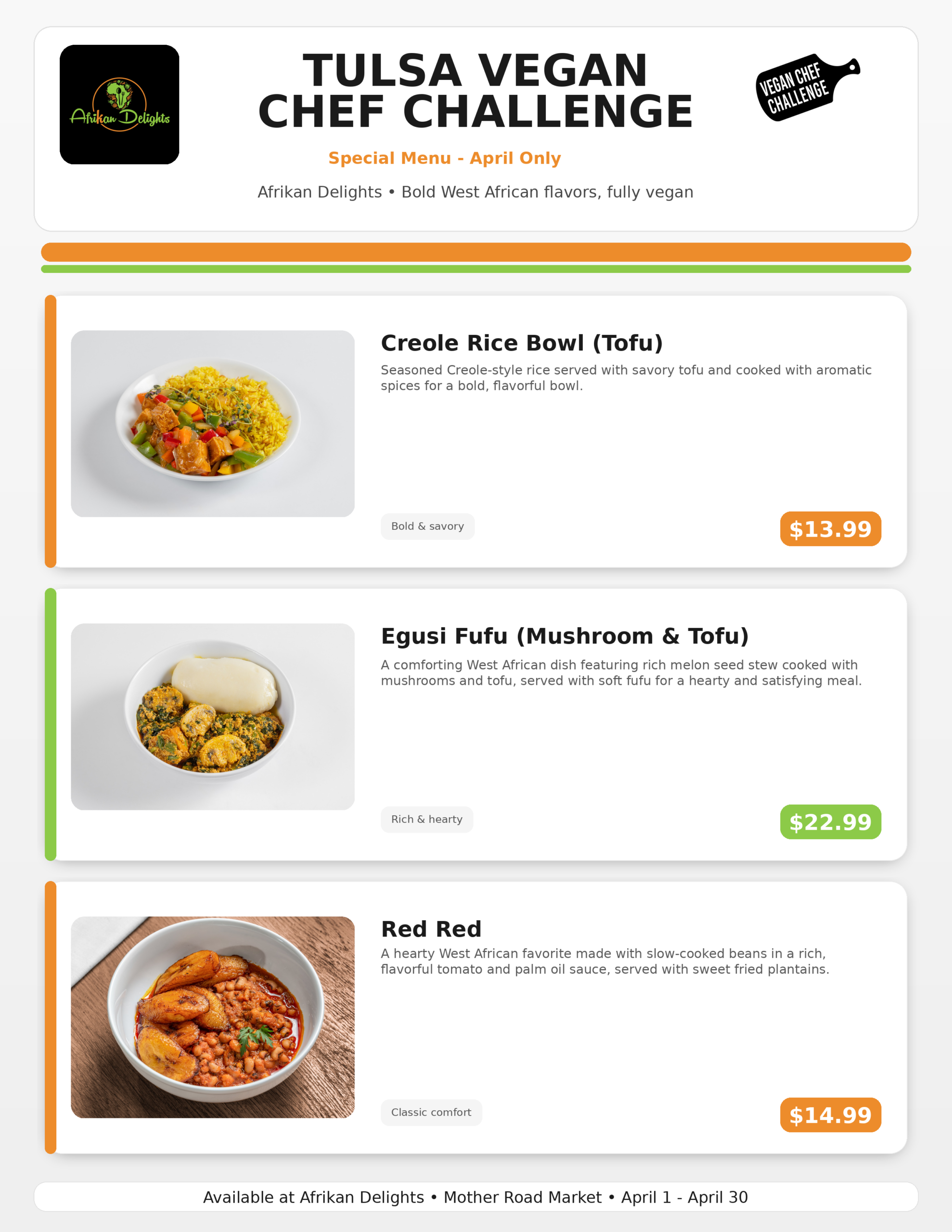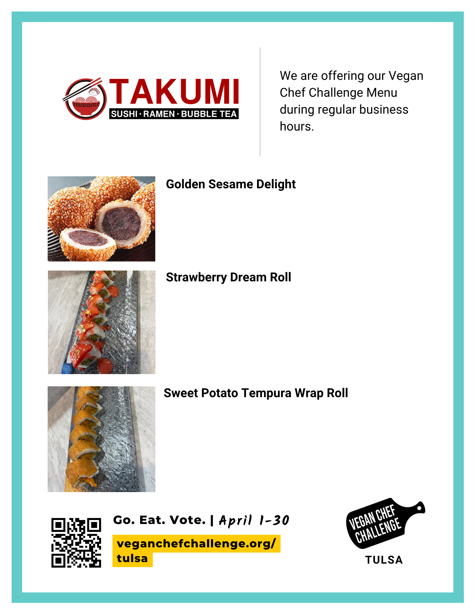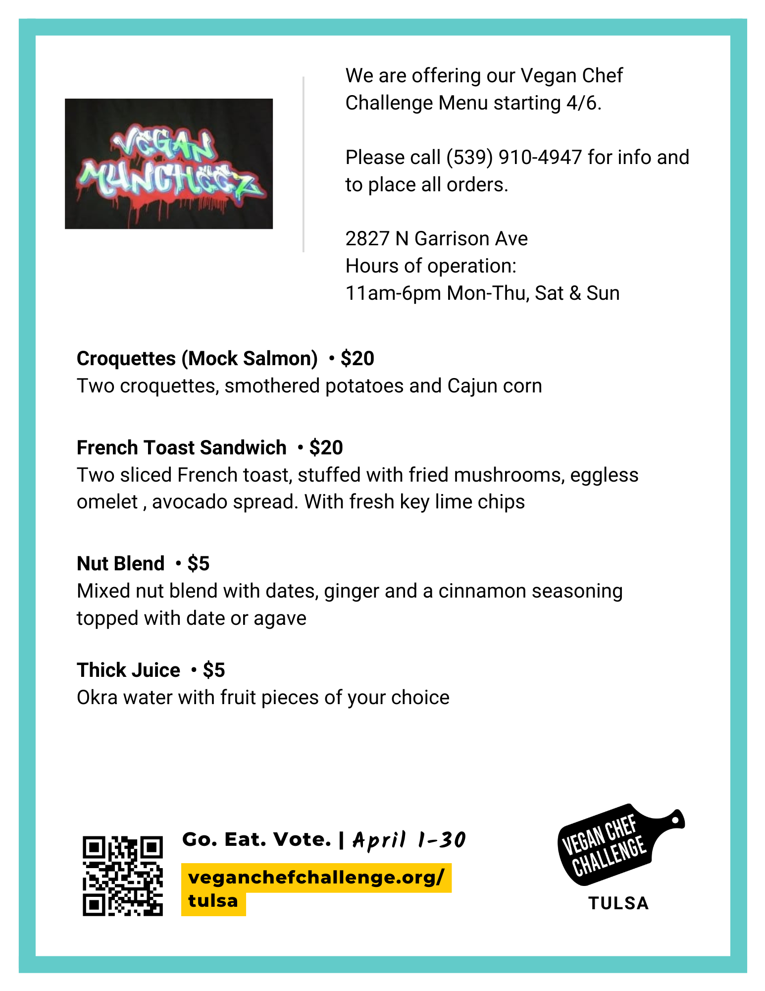 This challenge’s theme is Go Green, Tulsa! We will be encouraging diners to consider plant-based for the environment.
